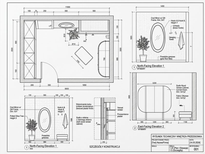 Przygotowuję szczegółową dokumentację, która pomoże wykonawcom w realizacji projektu. Zawiera wszystkie niezbędne informacje dotyczące materiałów, wymiarów i technologii.